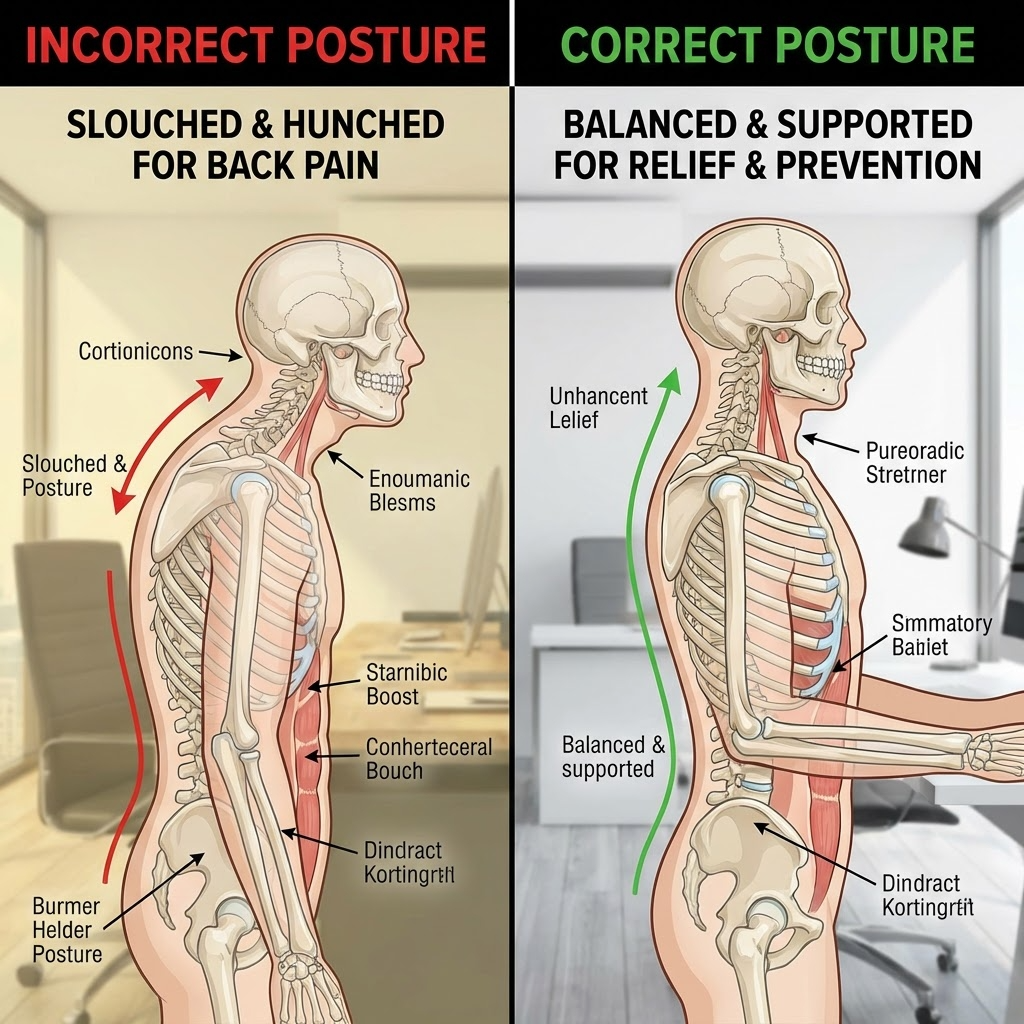 앉는 자세에서 허리가 힘들어지는 가장 흔한 이유는 골반이 뒤로 말리면서(후방 경사) 허리의 자연스러운 곡선(요추 전만)이 무너지는 것입니다. 쉽게 말해, 엉덩이가 앞으로 미끄러지고 등이 C자로 말리는 자세가 되면 허리는 ‘지지대를 잃은 상태’가 됩니다. 이때 허리 주변 근육은 계속 긴장해 버티고, 디스크에는 압력이 증가할 수 있습니다. 그래서 “오래 앉아 있으면 허리가 아프다”는 말은 사실 “오래 잘못 앉아 있으면”이 더 정확합니다.